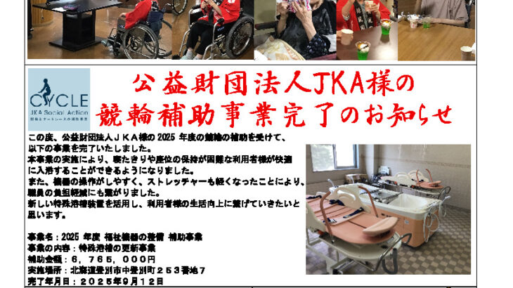 この度、公益財団法人JKA様の2025 年度の競輪の補助を受けて、以下の事業を完了いたしました。 本事業の実施により、寝たきりや座位の保持が困難な利用者様が快適に入浴することができるようになりました。 また、機器の操作が […]