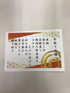 利用者様は折詰料理を食べながら、職員もジュースで乾杯をし、全員で年取りのお祝いをしました。