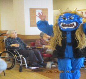 鬼が登場すると「鬼は外~!福は内~!」と紙を丸めた玉を豆に見立て、笑顔で力強く鬼にぶつけていました。最後は福の神が福をもたらしに来てくれました。