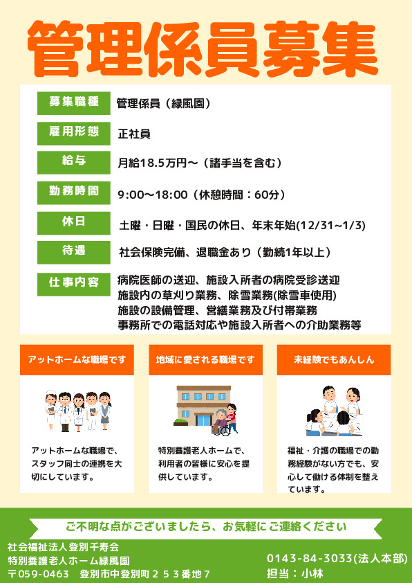 また、夜勤はできない方や、日勤帯のみのパート職員など相談に応じますので、お気軽に下にありますお問い合わせフォームか「採用担当LINEアカウント」にてお問い合わせください。